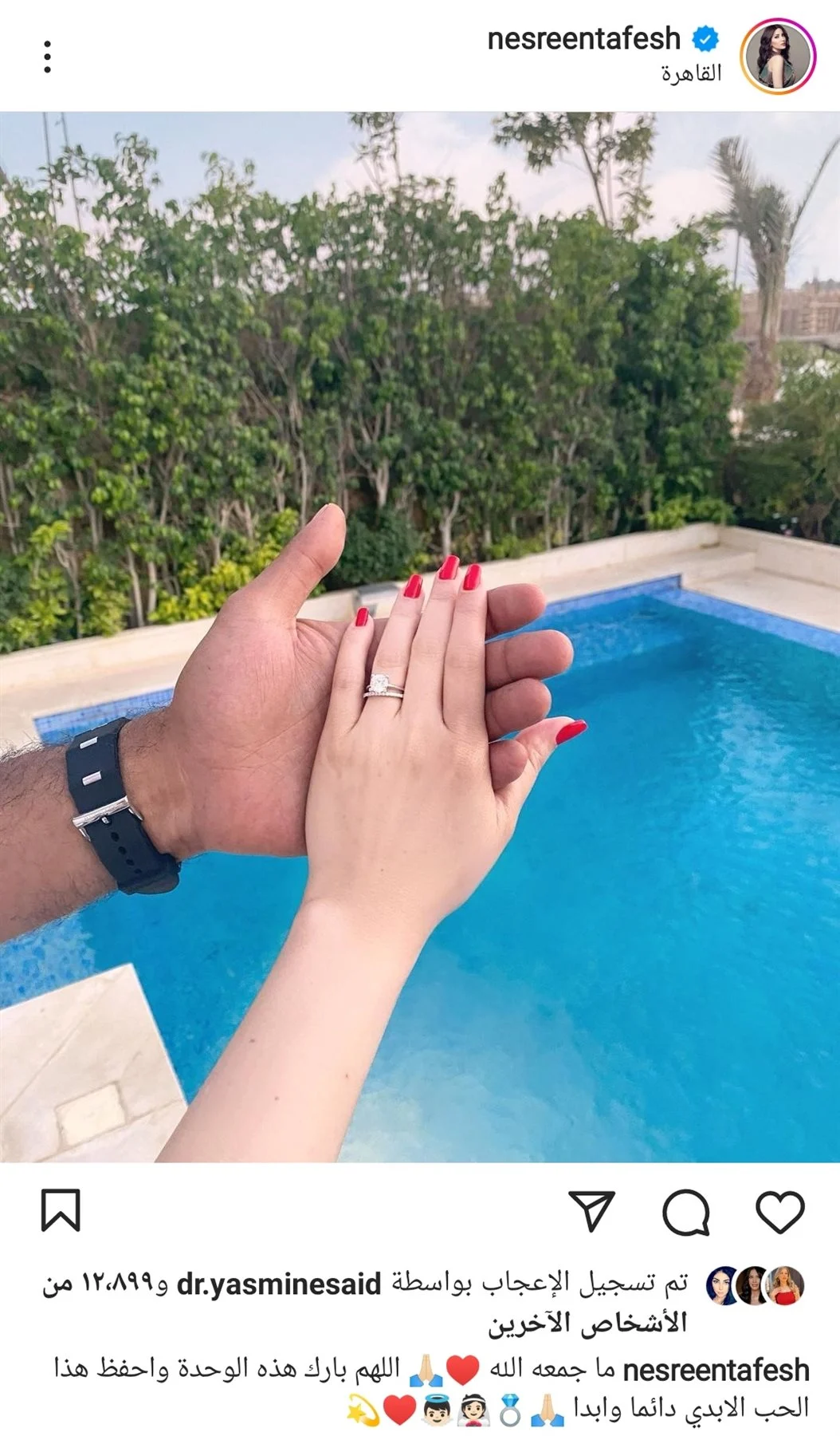 وشاركت الفنانة نسرين طافش ، جمهورها ومتابعيها، صورة جديدة عبر حسابها الشخصى بموقع التواصل الاجتماعى، لتبادل الصور والفيديوهات، إنستجرام، ظهرت خلالها، ترتدى خاتماً في يديها وتجمعها يد رجل.
