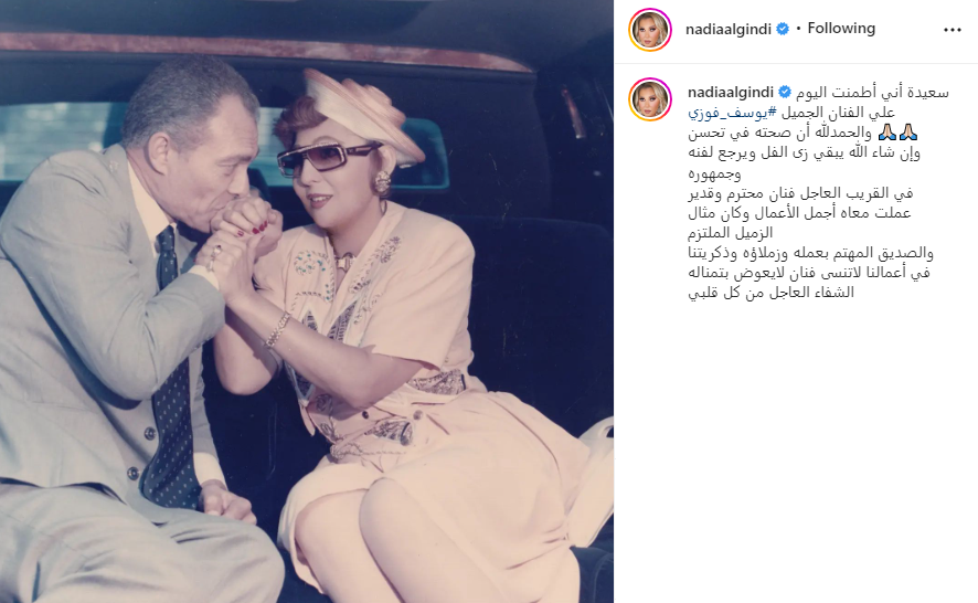 وشاركت الفنانة نادية الجندى، جمهورها، صورة جمعتها بالفنان يوسف فوزي ، من الأعمال الفنية التي قدموها سوياً، عبر صفحتها الشخصية بموقع التواصل الاجتماعى، لتبادل الصور والفيديوهات القصيرة، إنستجرام، وعلقت قائلة، «سعيدة أني اطمنت اليوم علي الفنان الجميل يوسف فوزي ، والحمد لله إن صحته في تحسن، وإن شاء الله يبقي زى الفل ويرجع لفنه وجمهوره في القريب العاجل».