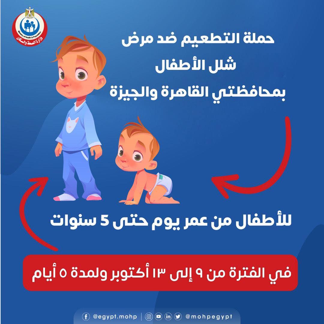 - أطلقت وزارة الصحة والسكان ، أمس الأحد، حملة التطعيم ضد مرض شلل الأطفال بالمجان ، لمدة 5 أيام في الفترة من 9 وحتي 13 أكتوبر الجاري، بمحافظتي القاهرة والجيزة فقط.