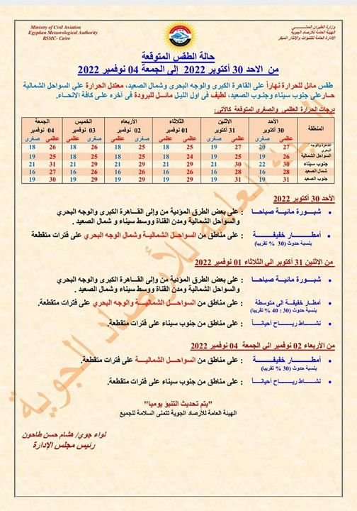 تصدرت حالة الطقس ، ترند محركات البحث المختلفة وبخاصة محرك البحث «جوجل» الأشهر عالمياً والأكثر بحثاً خلال الساعات القليلة الماضية بعد تداول رواد مواقع التواصل الاجتماعى، تحذيرالهيئة العامة للأرصاد الجوية تفاصيل حالة الطقس ودرجات الحرارة المتوقعة خلال الأيام القليلة المقبلة بداية من اليوم الأثنين 31 أكتوبر 2022 وحتى السبت 5 نوفمبر 2022.