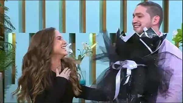 تعالى صوت تصفيق الجمهور في تفاعل مع اللحظة، فيما تملكت الفرحة من الفنانة رنا رئيس، وهي تقدم يدها ليضع الشاب خاتم الخطوبة في حضور شقيقها وشقيقتها الكبرى.
