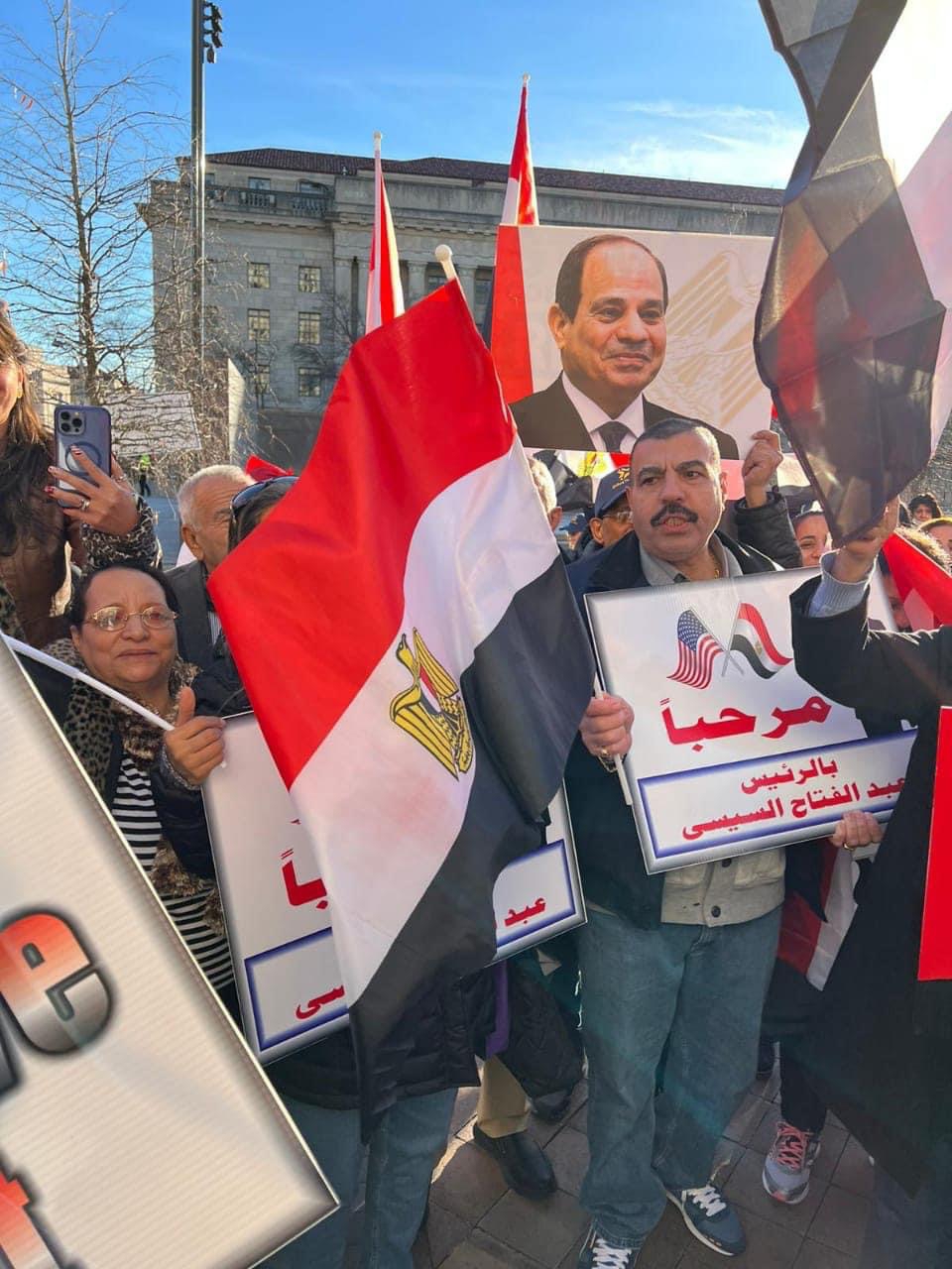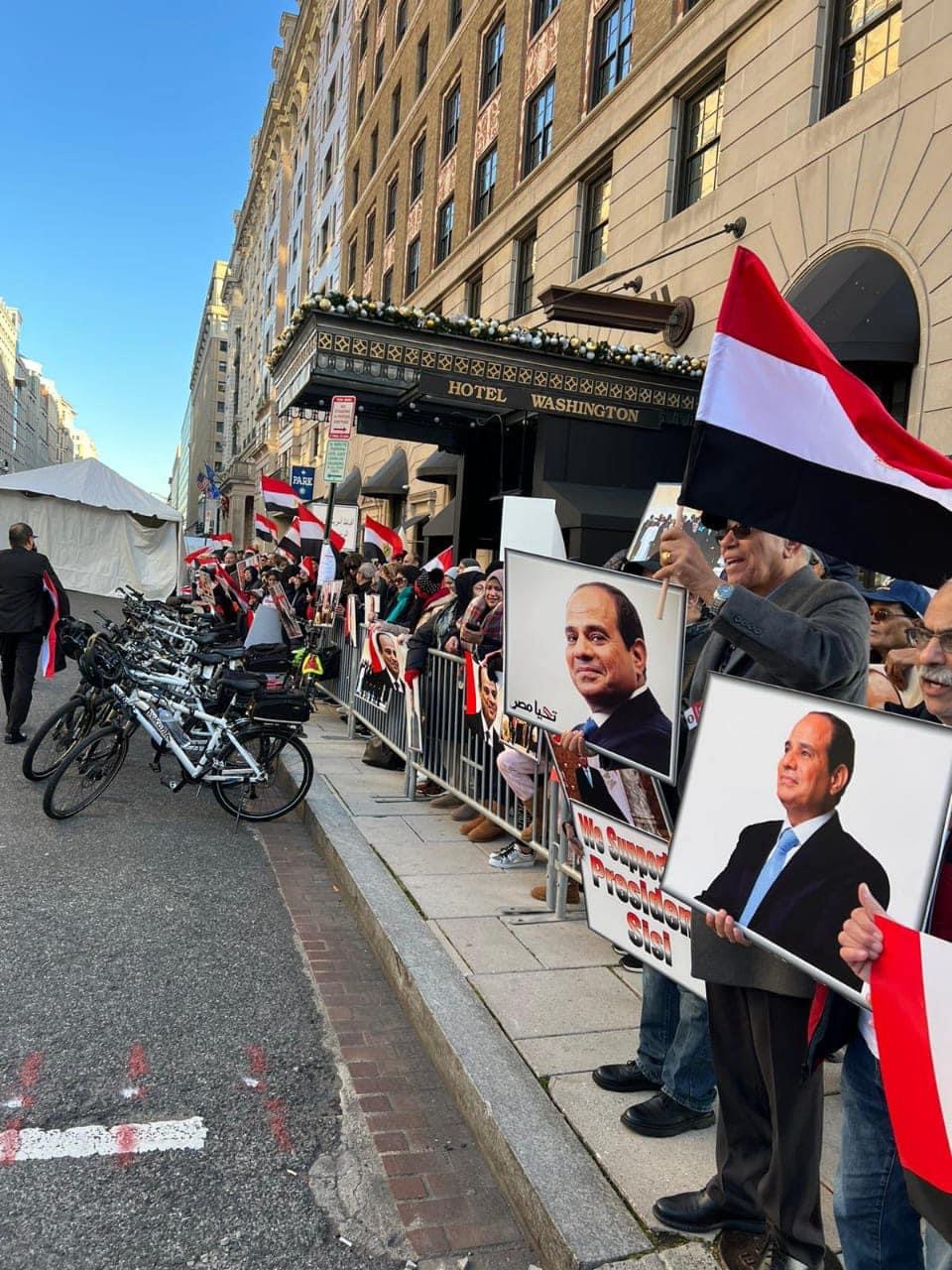 تجمع الشعرات من أبناء الجالية المصرية أمام مقر سكن الرئيس عبد الفتاح السيسي في واشنطن احتفالا بقدومه.