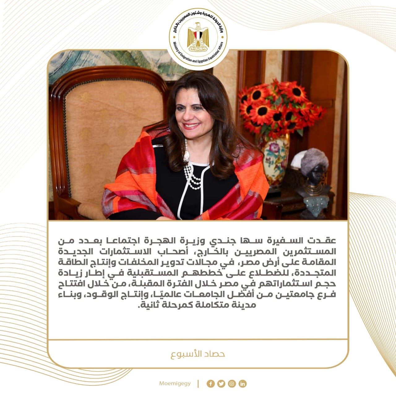 9- عقدت السفيرة سها جندي اجتماعا مع عدد من المستثمرين المصريين بالخارج أصحاب الاستثمارات الجديدة المقامة على أرض مصر، في مجالات تدوير المخلفات وإنتاج الطاقة المتجددة، وذلك للاطلاع على خططهم المستقبلية في إطار زيادة حجم استثماراتهم في مصر خلال الفترة المقبلة، من خلال افتتاح فرع جامعتين من أفضل الجامعات عالميا وإنتاج الوقود وبناء مدينة متكاملة.