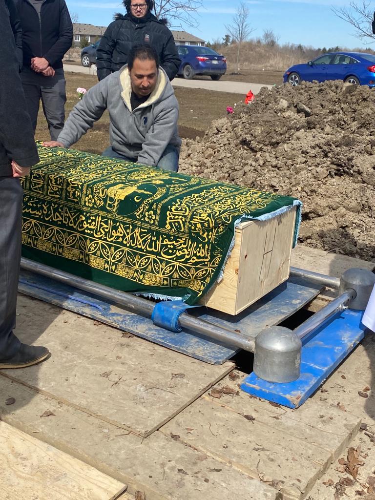 ووارى جثمانها الثرى بعد صلاة الجنازة في مقبرة قريبة بمدينة "أجاكس" بحضور عدد كبير من الجالية المصرية وأفراد عائلة الفقيدة.