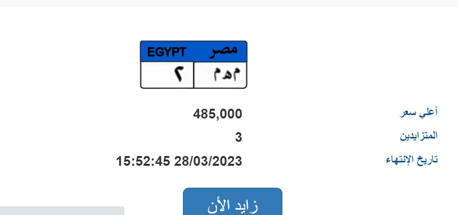 وينتهي اليوم في تمام الساعة 1:40 دقيقة المزايدة على لوحة “م ي ر - 555” والتي تبلغ قيمتها 50 مليون جنيه.