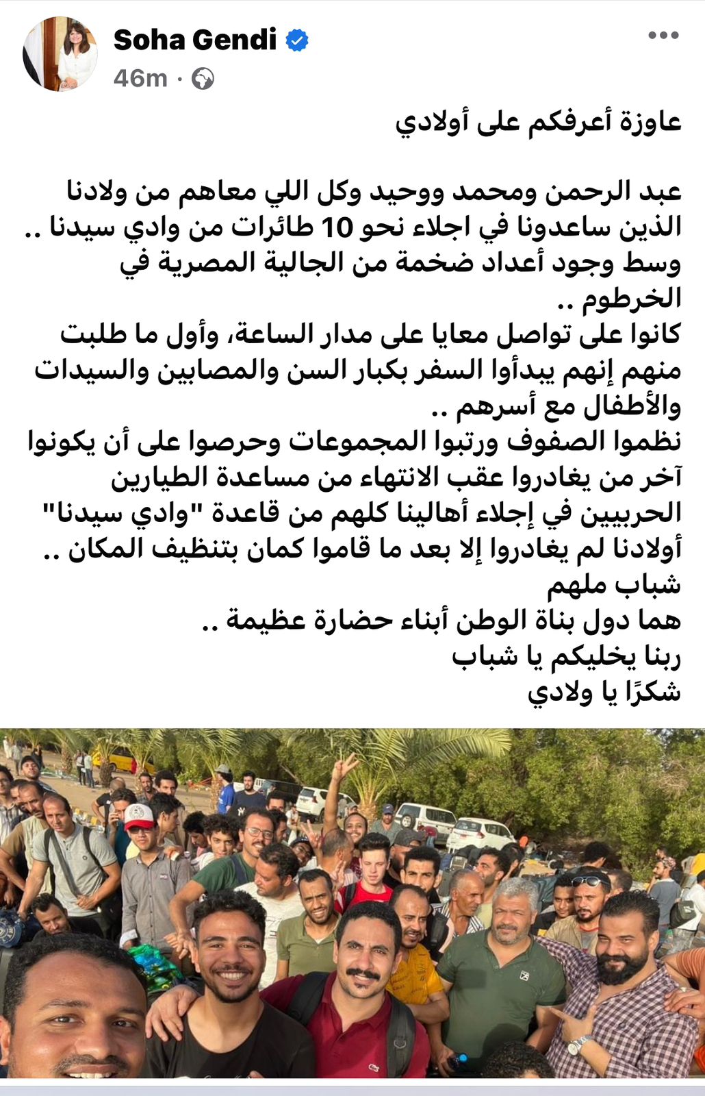 وكتبت وزيرة الهجرة عبر حسابها على موقع التواصل الاجتماعي “فيسبوك”: "عاوزه أعرفكم على أولادي عبدالرحمن وعبدالرحمن ومحمد ووحيد وكل اللي معاهم من ولادنا الذين ساعدونا في إجلاء نحو 10 طائرات من وادي سيدنا، وسط وجود أعداد ضخمة من الجالية المصرية في الخرطوم،