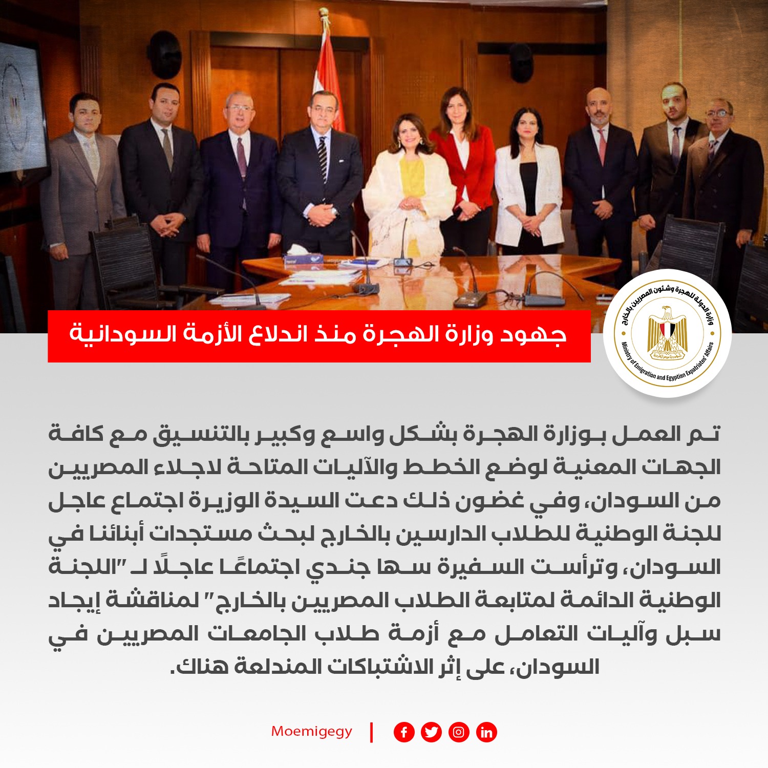 - تم العمل بوزارة الهجرة بشكل واسع وكبير بالتنسيق مع كافة الجهات المعنية لوضع الخطط والآليات المتاحة لاجلاء المصريين من السودان، وفي غضون ذلك دعت السيدة الوزيرة اجتماع عاجل للجنة الوطنية للطلاب الدارسين بالخارج لبحث مستجدات أبنائنا في السودان، وترأست السفيرة سها جندي اجتماعًا عاجلًا لـ "اللجنة الوطنية الدائمة لمتابعة الطلاب المصريين بالخارج" لمناقشة إيجاد سبل وآليات التعامل مع أزمة طلاب الجامعات المصريين في السودان، على إثر الاشتباكات المندلعة هناك.