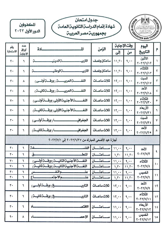 تعرف على موقف امتحانات الثانوية العامة خلال أيام إجازة عيد الأضحى