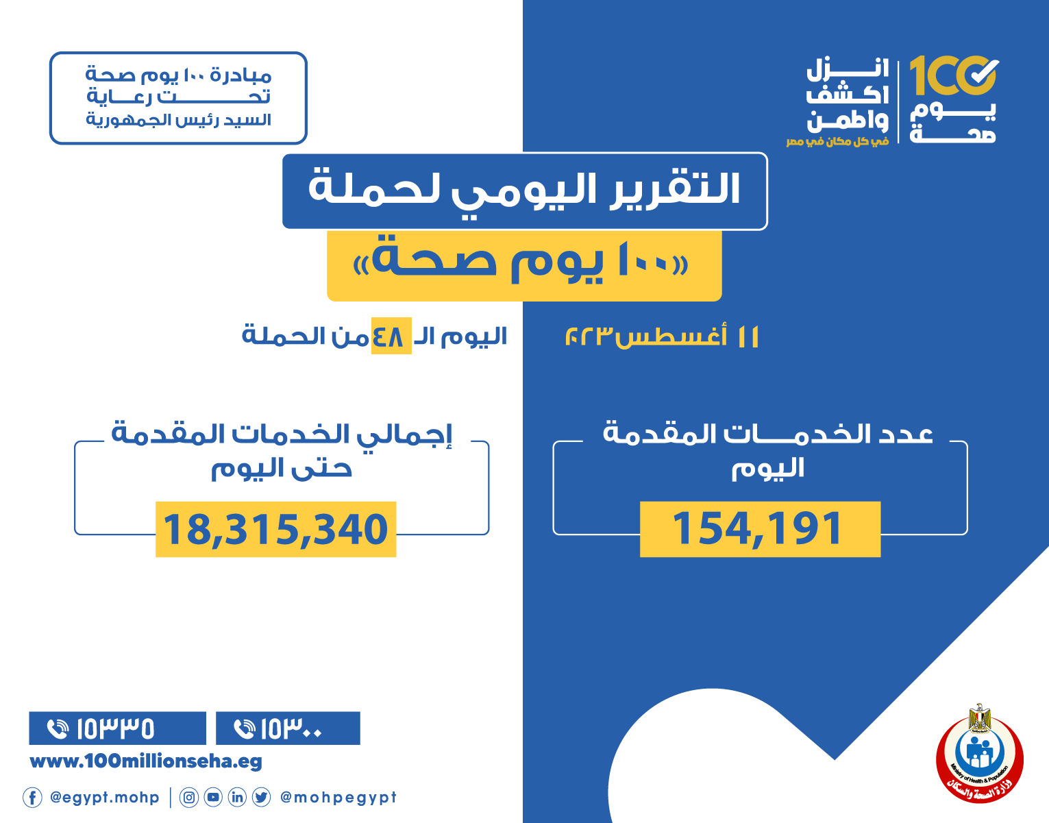 أعلن الدكتور خالد عبدالغفار وزير الصحة والسكان، أخر نتائج حملة 100 يوم صحة، مؤكدة أنه تم تقديم 154 ألفا و191 خدمة، ضمن المبادرات الرئاسية وجميع التخصصات الطبية والعلاجية والوقائية وتنظيم الأسرة، من خلال حملة 100 يوم صحة، أمس الجمعة 11 أغسطس، في جميع محافظات الجمهورية.