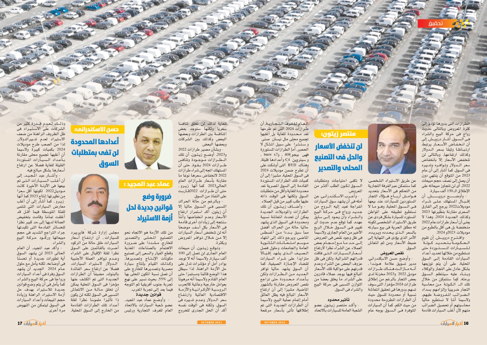البداية مع مقال الكاتب الصحفي خالد النجار رئيس تحرير "أخبار السيارات" والذي جاء تحت عنوان "لم تكن الدولة بعيدة عن ملف السيارات بل تدخلت بدعم كبير ومبادرات جادة"، حيث قال إن الدولة لم تكن بعيدة عن ملف السيارات، بل تدخلت بدعم كبير واهتمام أكبر، واتخذت خطوات جادة مـن خلال مبادرة تحويل السيارات للغاز الطبيعى، وتوسعت فـى عملية إحلال السيارات مما كان له الأثر الواضح فى تجديد شباب السيارات، كذلك جاءت مبادرة استيراد المصريين بالخارج لتدعم السوق وتساند المواطنين بما يسمح باستقدام سيارة للعاملين بالخارج بتسهيلات وتيسيرات واستجابة لمد فترة العمل أكـثـر من مـرة لضمان استفادة عدد كبير من المصريين بالخارج.