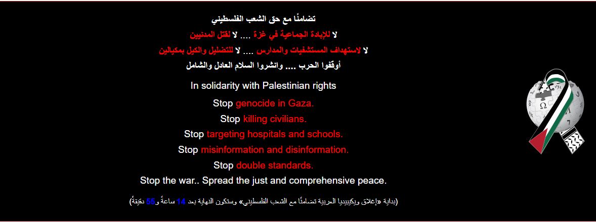 أعلن موقع ويكيبيديا العربي توقفه عن العمل تضامنًا مع الشعب الفلسطيني، واحتجاجًا على استمرار الإبادة الجماعية في قطاع غزة، ودعوة لوقف الحرب ونشر السلام العادل والشامل.