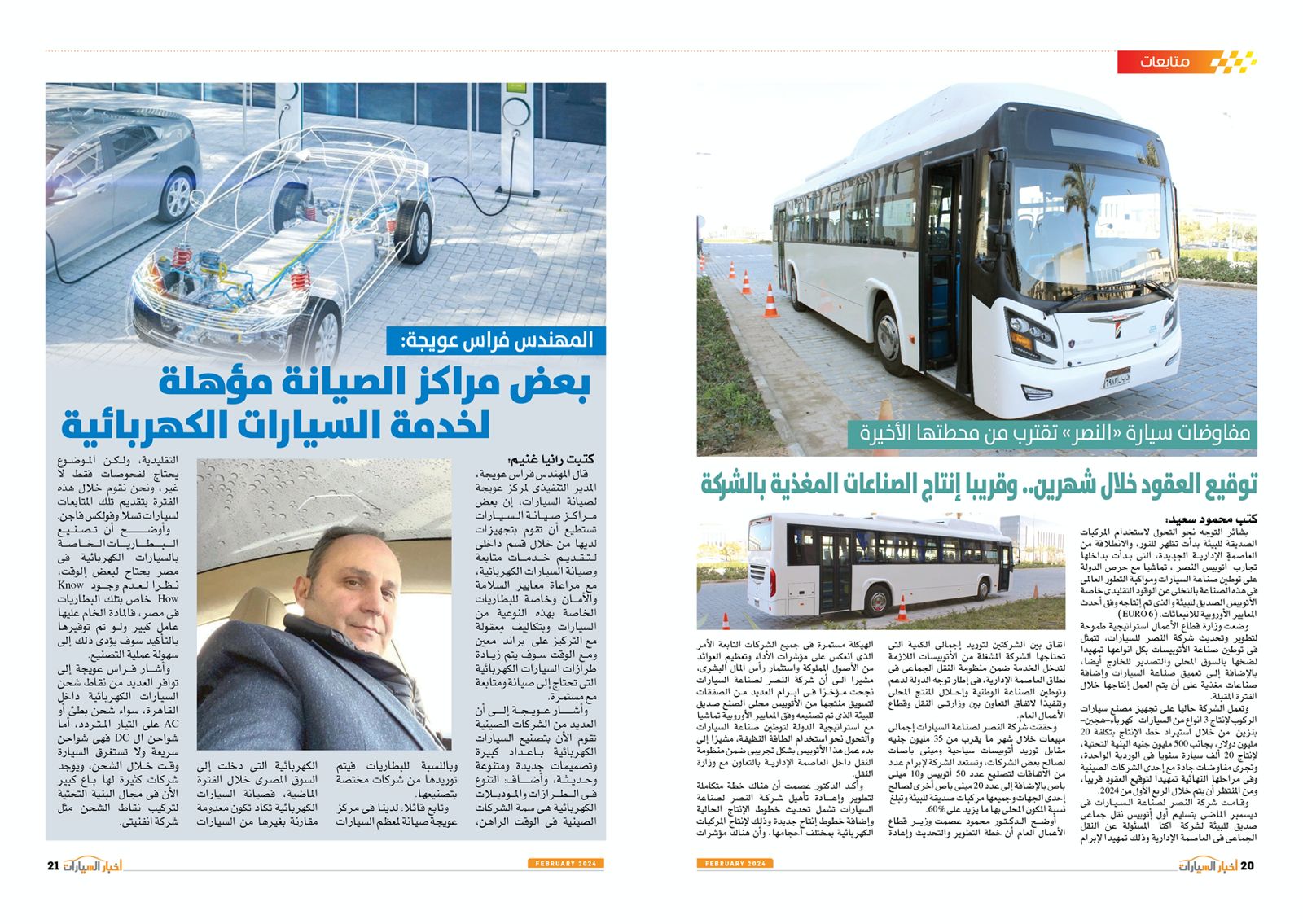وجاء في العدد حوارات مع المهندس فراس عويجة المدير التنفيذى لمركز عويجة لصيانة السيارات، المهندس محمد شفيق رئيس مجلس إدارة شركة «كيلو واط» لشواحن السيارات الكهربائية، المهندس أحمد نوار مدير عام العمليات بشركة «شاحن» لحلول المركبات الكهربائية، بريكس تجمع الأمل والعمل، تحديات أمام قطاع السيارات.