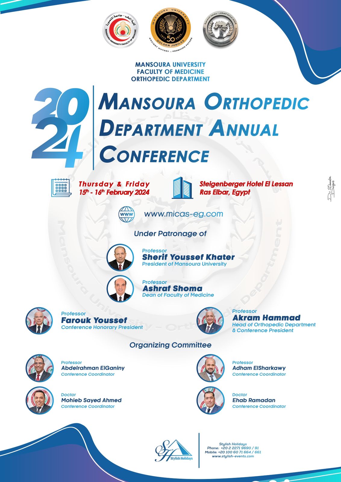 يعقد المؤتمر السنوي لقسم جراحة العظام - بكلية الطب جامعة المنصورة يومى ١٥ - ١٦ فبراير ٢٠٢٤ تحت رعاية الدكتور شريف خاطر رئيس جامعة المنصورة، والدكتور أشرف شومة عميد كلية الطب.
