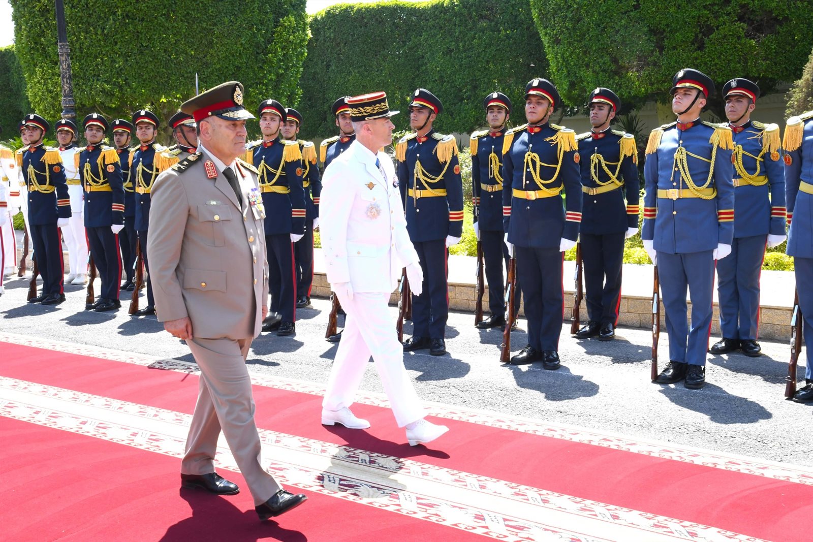 وكان الفريق أسامة عسكر رئيس أركان حرب القوات المسلحة قد استقبل رئيس هيئة الأركان العامة للقوات المسلحة الفرنسية حيث أجريت له مراسم استقبال رسمية بمقر الأمانة العامة لوزارة الدفاع وعزفت الموسيقات العسكرية السلام الوطني لكلا البلدين.
