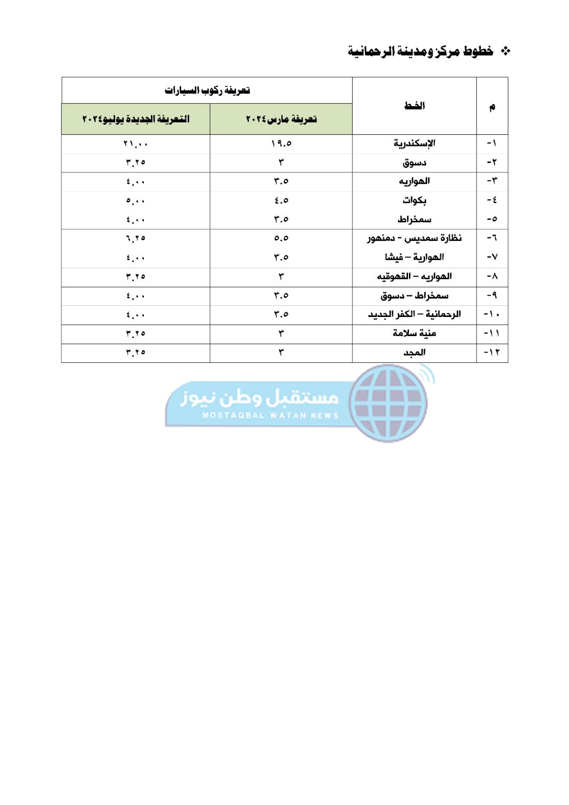 - قيمة تذكرة مركبات مشروع النقل الداخلي من 3,50 جنيه لتصبح 4 جنيهات.
