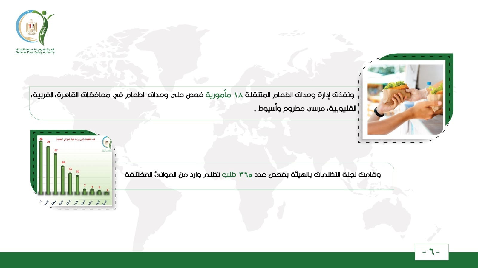 وشن فريق إدارة الشكاوى حملات على 428 منشأة غذائية للتأكد من سلامة المنتجات الغذائية المعروضة في محافظات الغربية، الغردقة، القاهرة، الاسماعيلية، المنوفية والوادي الجديد، مع اتخاذ كافة الإجراءات التصحيحية اللازمة في حالة وجود أية ملاحظات متعلقة باشتراطات سلامة الغذاء.