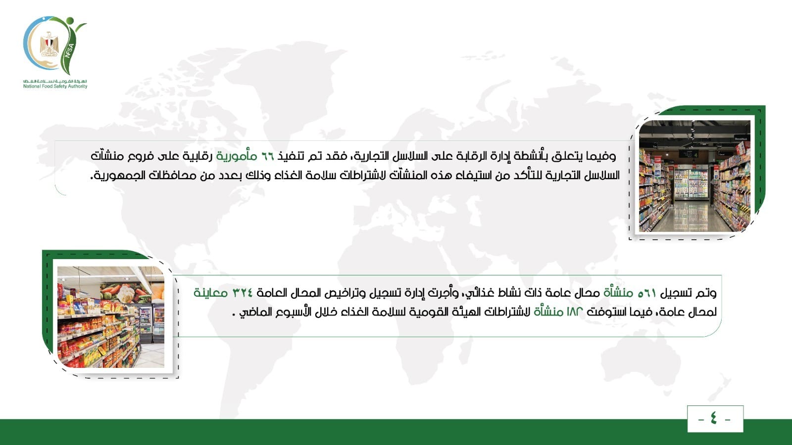 وفيما يتعلق بأنشطة إدارة الرقابة على السلاسل التجارية، فقد تم تنفيذ 66 مأمورية رقابية على فروع منشآت السلاسل التجارية للتأكد من استيفاء هذه المنشآت لاشتراطات سلامة الغذاء وذلك بعدد من محافظات الجمهورية.