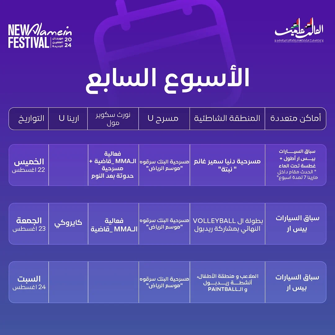 كشف مهرجان العلمين الجديدة خلال صفحته الرسمية على "فيسبوك" عن فعاليات شهر أغسطس، من حفلات غنائية وعروض مسرحية وفعاليات رياضية ومسابقات ترفيهية وفعاليات خاصة للأطفال.