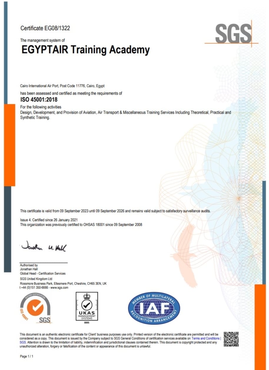 كما قامت شركة (SGS) بتجديد اعتماد أكاديمية مصر للطيران للتدريب لشهادات الجودة والبيئة والسلامة والصحة المهنية (ISO 14001:2015)-(45001:2018) -(ISO 9001:2015)