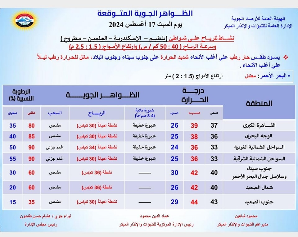 ويتوقع خبراء هيئة الأرصاد الجوية أن يسود، غدًا، طقس حار رطب نهارًا على القاهرة الكبرى والوجه البحري والسواحل الشمالية، وشديد الحرارة على جنوب سيناء وجنوب البلاد.