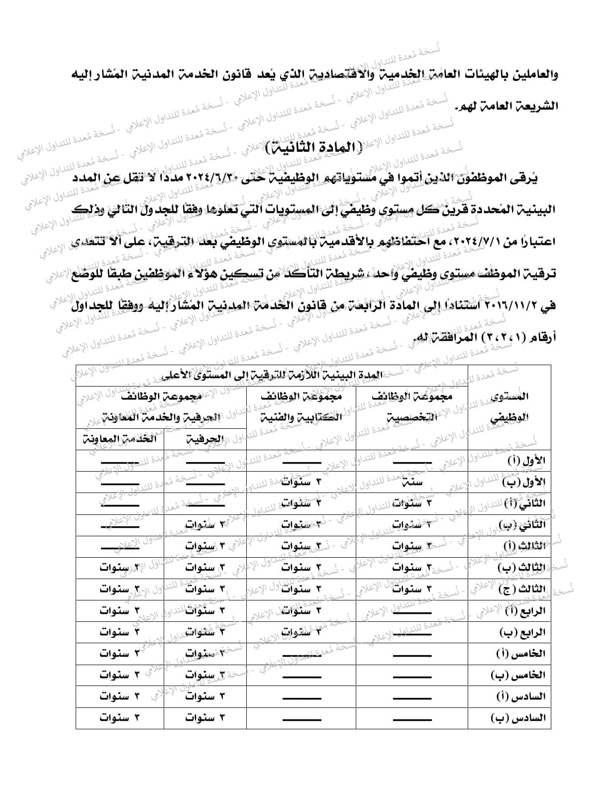 كما تضمن القرار أن يُرقى شاغلو الوظائف الكتابية والفنية بالدرجة الخامسة المعينون قبل العمل بأحكام قانون الخدمة المدنية المُشار إليه والمستوفون مدة بينية لا تقل عن خمس سنوات حتى ٣٠/٦/٢٠٢٤ إلى المستوى الوظيفي الرابع (ب)، ويستحق الموظف المُرقى اعتبارًا من ١/٧/٢٠٢٤، الأجر الوظيفي المقرر للوظيفة المرقى إليها، أو أجره السابق مضافًا إليه علاوة ترقية بنسبة (٥٪) من هذا الأجر الوظيفي أيهما أكبر محسوبة على أجره في ٣٠/٦/٢٠٢٤.