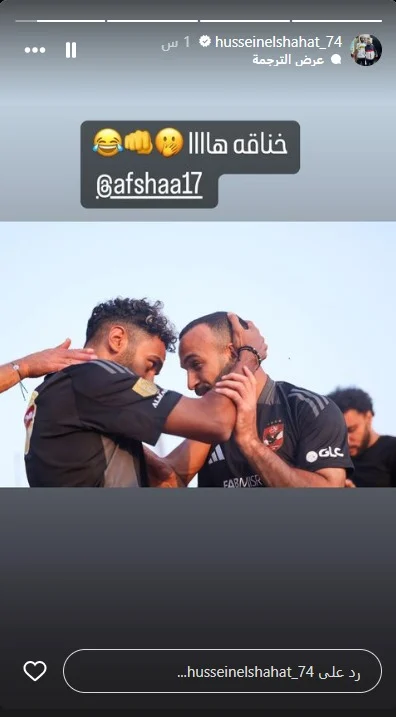 شارك حسين الشحات، لاعب الأهلي، صورته مع محمد مجدي أفشة زميله على هامش مران الفريق الأحمر أمس الثلاثاء، بعدما أمسك به على سبيل الهزار خلال المران.