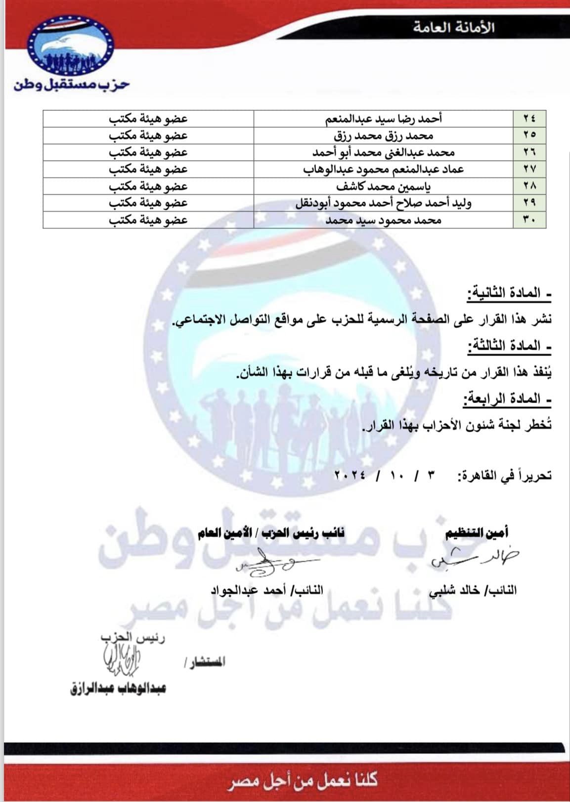 كما أصدر حزب مستقبل وطن قرارًا بتعيين تشكيل هيئة أمانة مكتب العمل الجماهيري بالإضافة إلى تشكيل هيئة مكتب أمانة الشباب، والتي جاءت كالتالي: