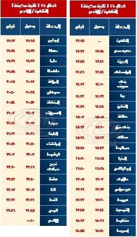 وتقرر اعتباراً من يوم الخميس الموافق 30 /10 / 2024 تشغيل قطار 998 القاهرة / سوهاج بتركيب 9 عربات مكيفة فرنساوى مطور يقوم من محطة القاهرة الساعة 01:00 ظهراً ويصل محطة سوهاج الساعة 08:15 مساء، ويعود بقطار 999 سوهاج / القاهرة على أن يقوم من محطة سوهاج الساعة 10:15 مساء ويصل محطة القاهرة الساعة 05:25 صباح اليوم التالى بنفس التركيب الوارد به قطار 998 لمحطة سوهاج طبقاً للجداول المرفقة.