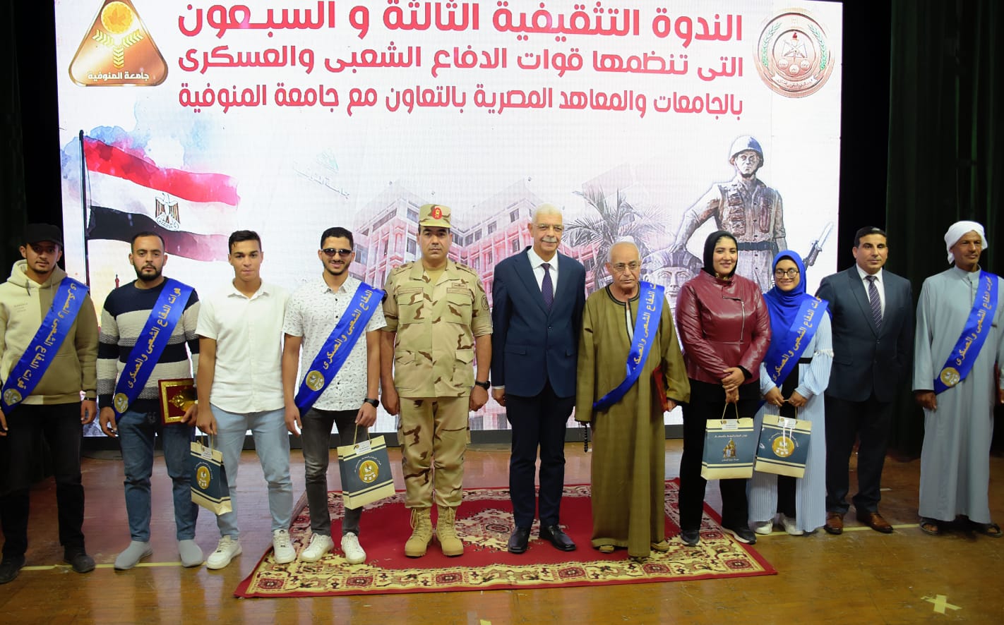 كما نظمت قيادة قوات الدفاع الشعبي والعسكري ثلاث ندوات تثقيفية بجامعات طنطا والأزهر والمنوفية لإلقاء الضوء على المخاطر والتحديات والتهديدات التي تواجه الدولة المصرية والدور الذي تقوم به الدولة في مختلف المجالات وذلك من خلال عدد من المحاضرات التوعوية، بالإضافة إلى مجموعة من العروض والأعمال الفنية المعبرة عن إبداع الطلبة، بحضور محافظ الغربية ومفتي الديار المصرية ووكيل الأزهر الشريف ورؤساء الجامعات.