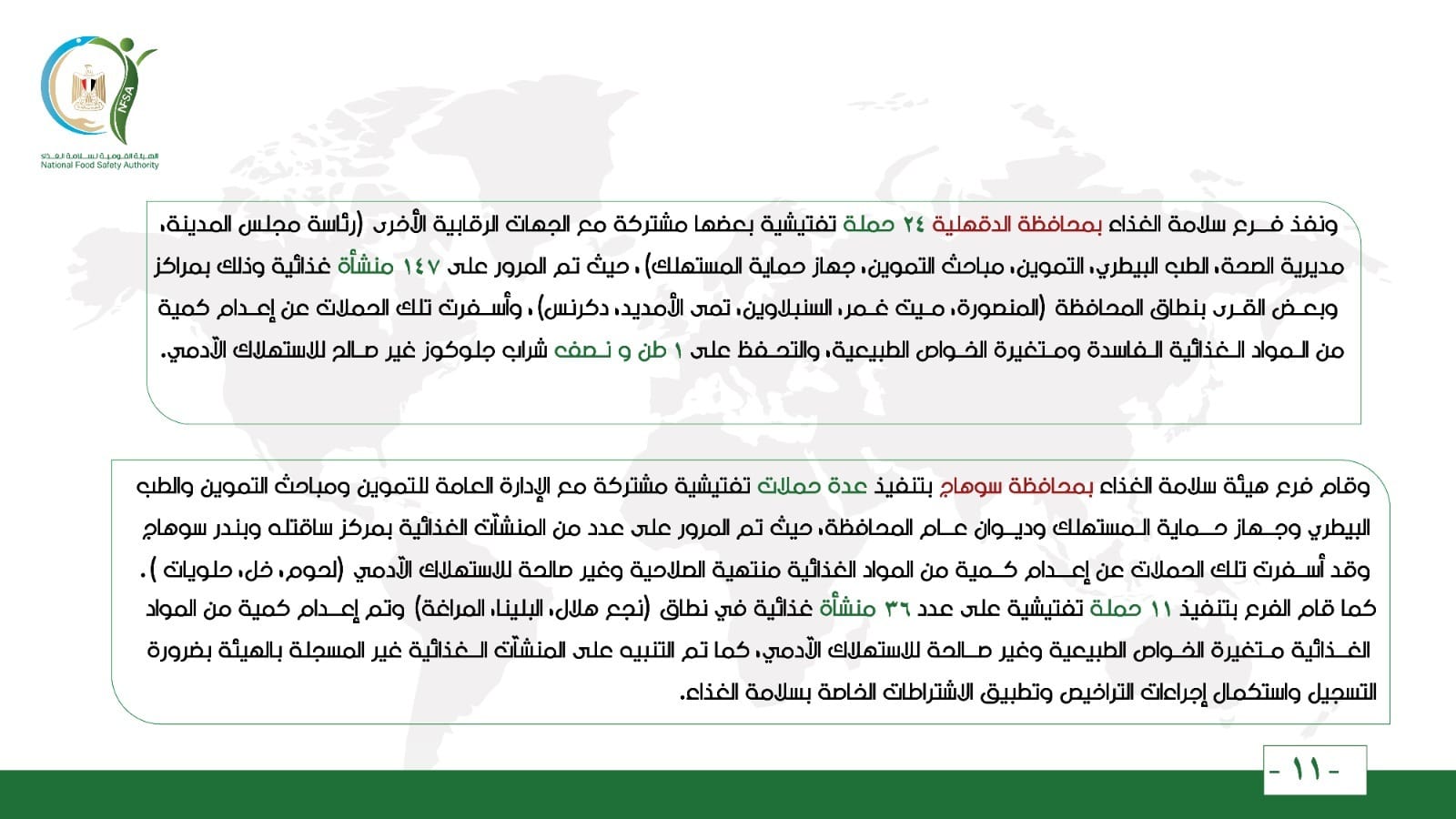 كما قام الفرع بتنفيذ 11 حملة تفتيشية على عدد 36 منشأة غذائية في نطاق (نجع هلال، البلينا، المراغة) وتم إعدام كمية من المواد الغذائية متغيرة الخواص الطبيعية وغير صالحة للاستهلاك الآدمي، كما تم التنبيه على المنشآت الغذائية غير المسجلة بالهيئة بضرورة التسجيل واستكمال إجراءات التراخيص وتطبيق الاشتراطات الخاصة بسلامة الغذاء.