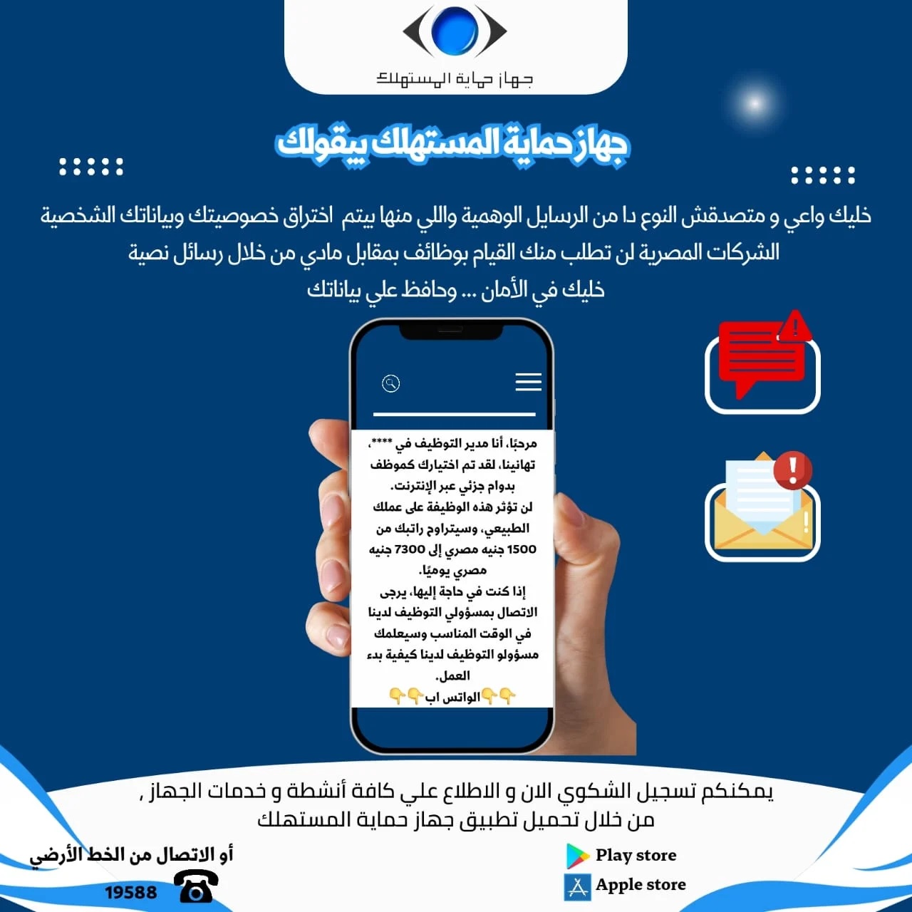 وناشد الجهاز المستهلكين بتجاهل هذا النوع من الرسائل عبر مُختلف تطبيقات التواصل الاجتماعي، والتي تطلب الدخول على إحدى الروابط للقيام بأعمال معينة مقابل راتب من الشركة.