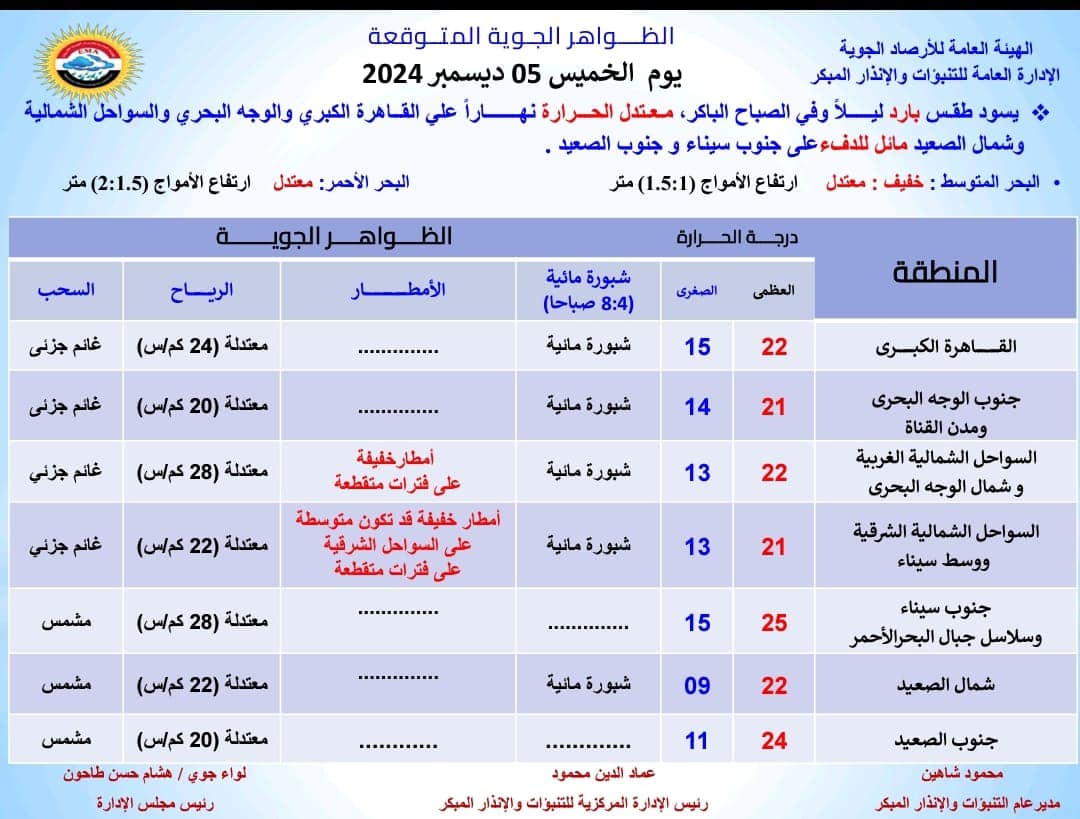 وذكرت الهيئة- في بيان، أنه من المتوقع وفقًا لـ طقس اليوم شبورة مائية صباحًا على بعض الطرق الزراعية والسريعة والقريبة من المسطحات المائية، بالإضافة إلى أمطار خفيفة قد تكون متوسطة على مناطق من السواحل الشمالية الشرقية تمتد خفيفة إلى مناطق من السواحل الشمالية الغربية وشمال الوجه البحري على فترات متقطعة.