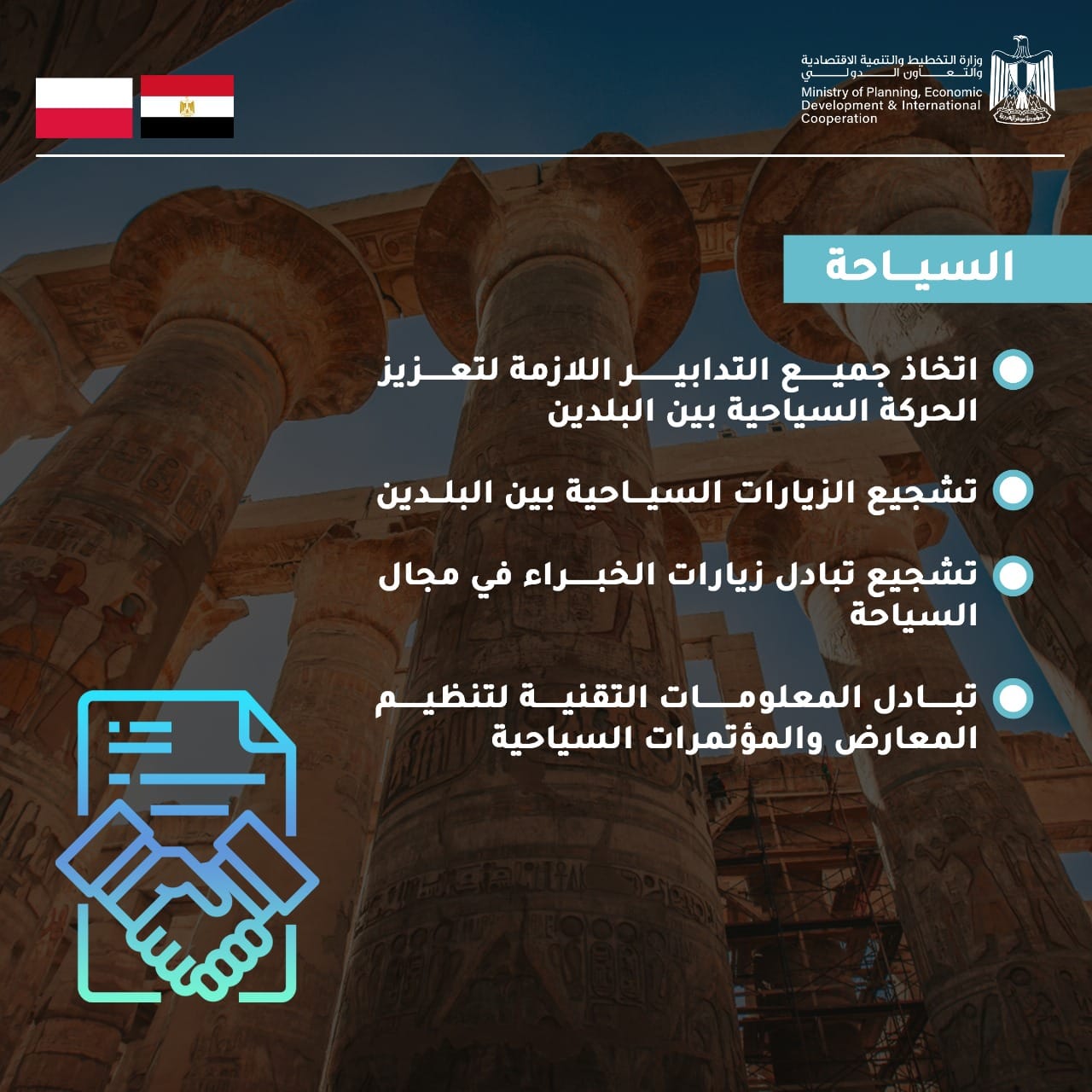 وفي ختام اللجنة المشتركة في دورتها الأولى، وقّعت وزيرة التخطيط والتعاون الدولي وكريستوف باسزيك، وزير التنمية الاقتصادية والتكنولوجيا بجمهورية بولندا، بروتوكول الدورة الأولى من اللجنة، الذي اتفق فيه الجانبان على تعزيز التعاون المُشترك في 16 مجالًا في قطاعات التجارة والاستثمار والتحول الرقمي والتحول الأخضر وغيرها.