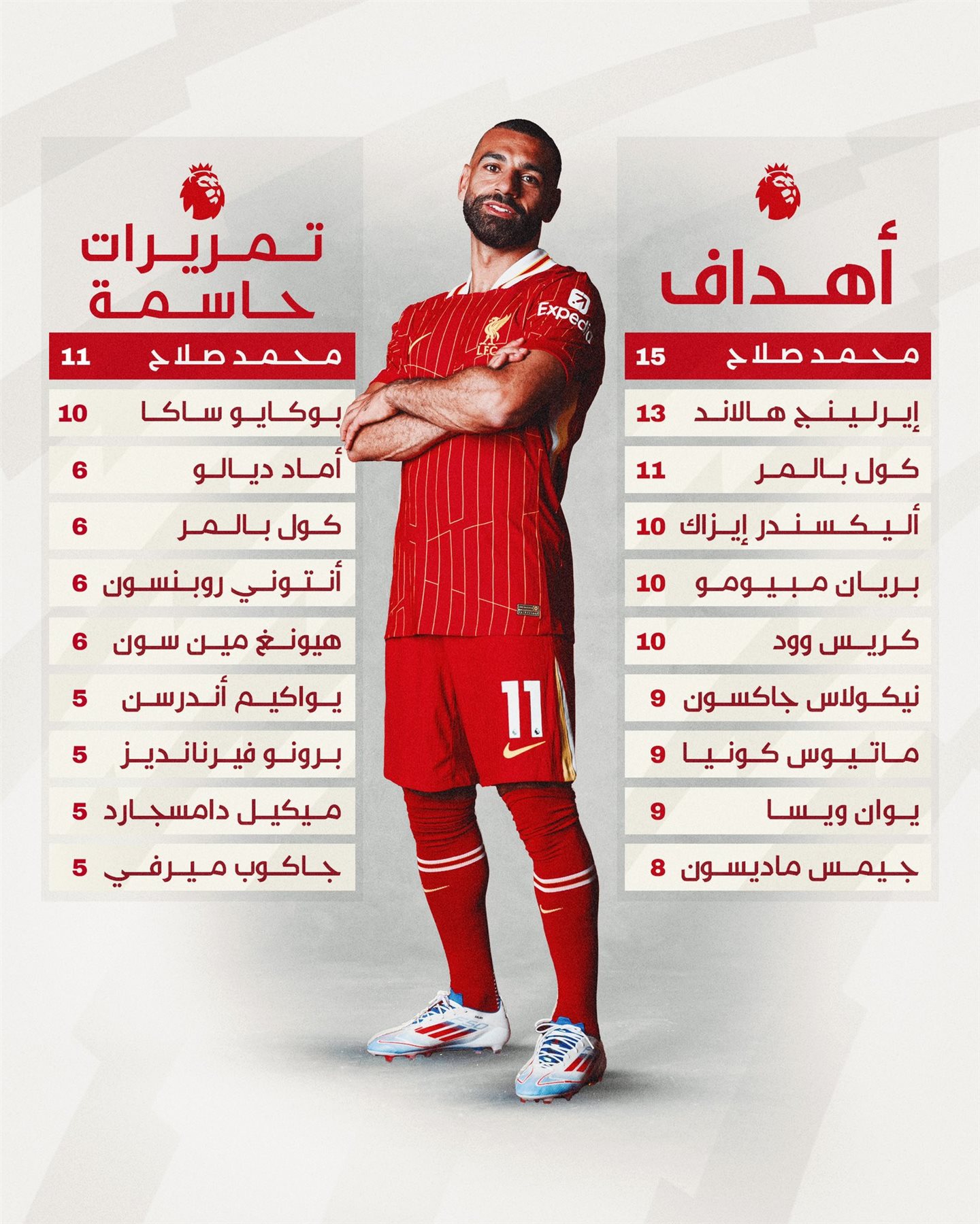 وأبرز حساب ليفربول الرسمي الأرقام القياسية التي حققها محمد صلاح هذا الموسم فقد تصدر صلاح قائمة هدافي الدوري الإنجليزي برصيد 15 هدفًا، متفوقًا بفارق هدفين على أقرب منافسيه، كما تصدر قائمة أكثر اللاعبين صناعة للأهداف في الدوري، مما يؤكد دوره المحوري في هجوم الفريق.