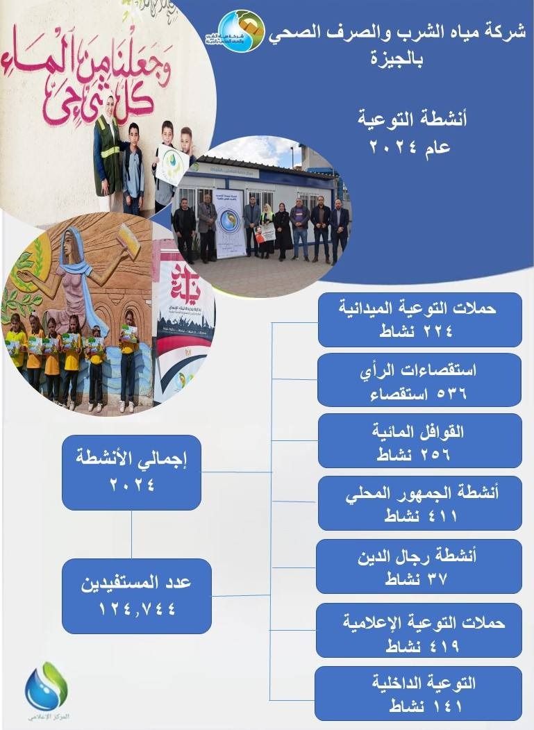 وفي إطار مساعي الشركة لرفع الوعي المائي، وتعزيز ثقافة ترشيد استهلاك المياه، والاستخدام الأمثل لشبكات الصرف الصحي، أشار رئيس مياه الشرب بالجيزة، إلى أن فريق التوعية نفذ ٢٠٢٤ نشاطاً توعوياً هذا العام بإجمالي١٢٤.٧٤٤ مستفيداً من مختلف الفئات العمرية بقرى ومدن محافظة الجيزة، وبالتعاون مع كافة الجهات المعنية بقضية ترشيد استهلاك المياه، في ضوء برامج التوعية المائية، والحملات المتنوعة، والأنشطة التفاعلية، حيث تضمنت حملات التوعية الميدانية ٢٢٤ نشاطاً، ٢٥٦ نشاطاً بالقوافل المائية الشاملة، فيما بلغت أنشطة الجمهور المحلي ٤١١ نشاطاً، ٣٧ نشاطاً بالتعاون مع رجال الدين، ٤١٩ نشاطاً من خلال حملات التوعية الإعلامية عبر وسائل الإعلام الجديد، ١٤١ نشاطاً استهدف التوعية الداخلية العاملين.