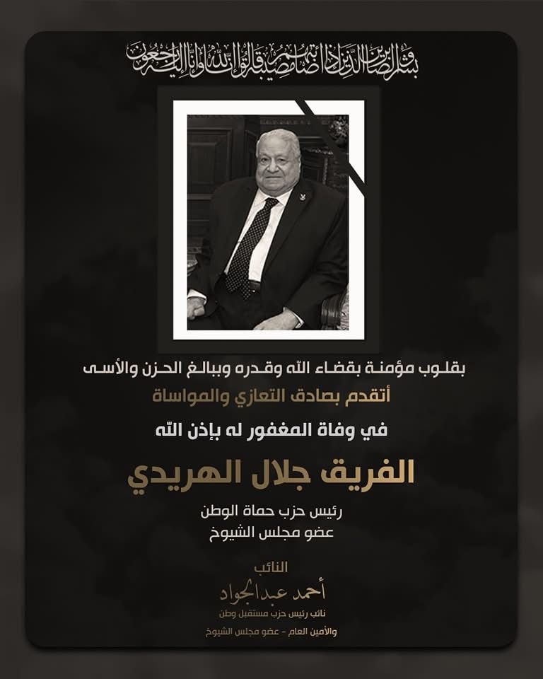 كان قد أعلن بيان صادر عن حزب حماة الوطن عن وفاة الفريق جلال الهريدي رئيس الحزب.