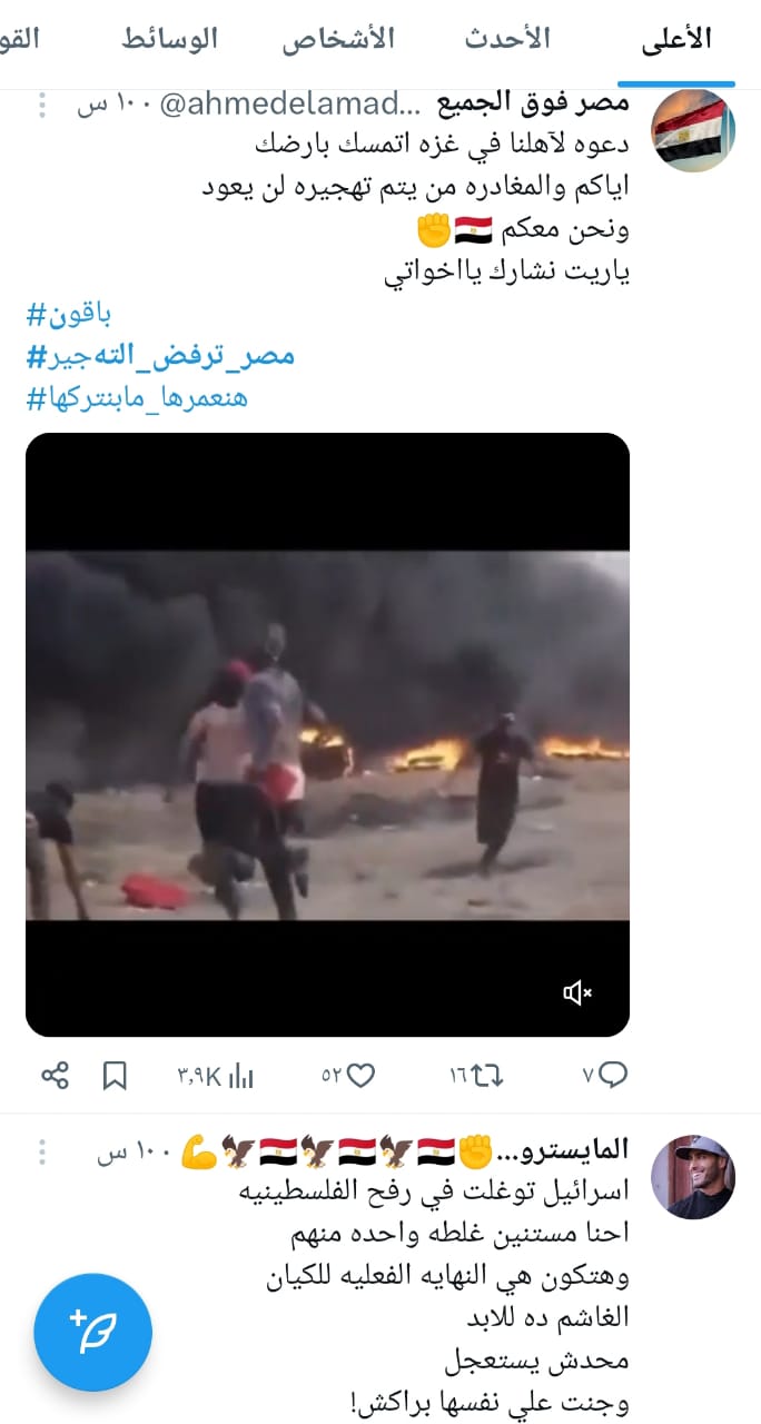 وقال احد الرواد:" الجيش المصري علي كل شبر، في ارض سيناء جنبا الي جنب، مع اهالي سيناء المصريين،وبيقوللكم سيناء خط احمر،ايها العرب المتصهينين، #باقون،#مصر_ترفض_التهجير ، #هنعمرها_مابنتركها".