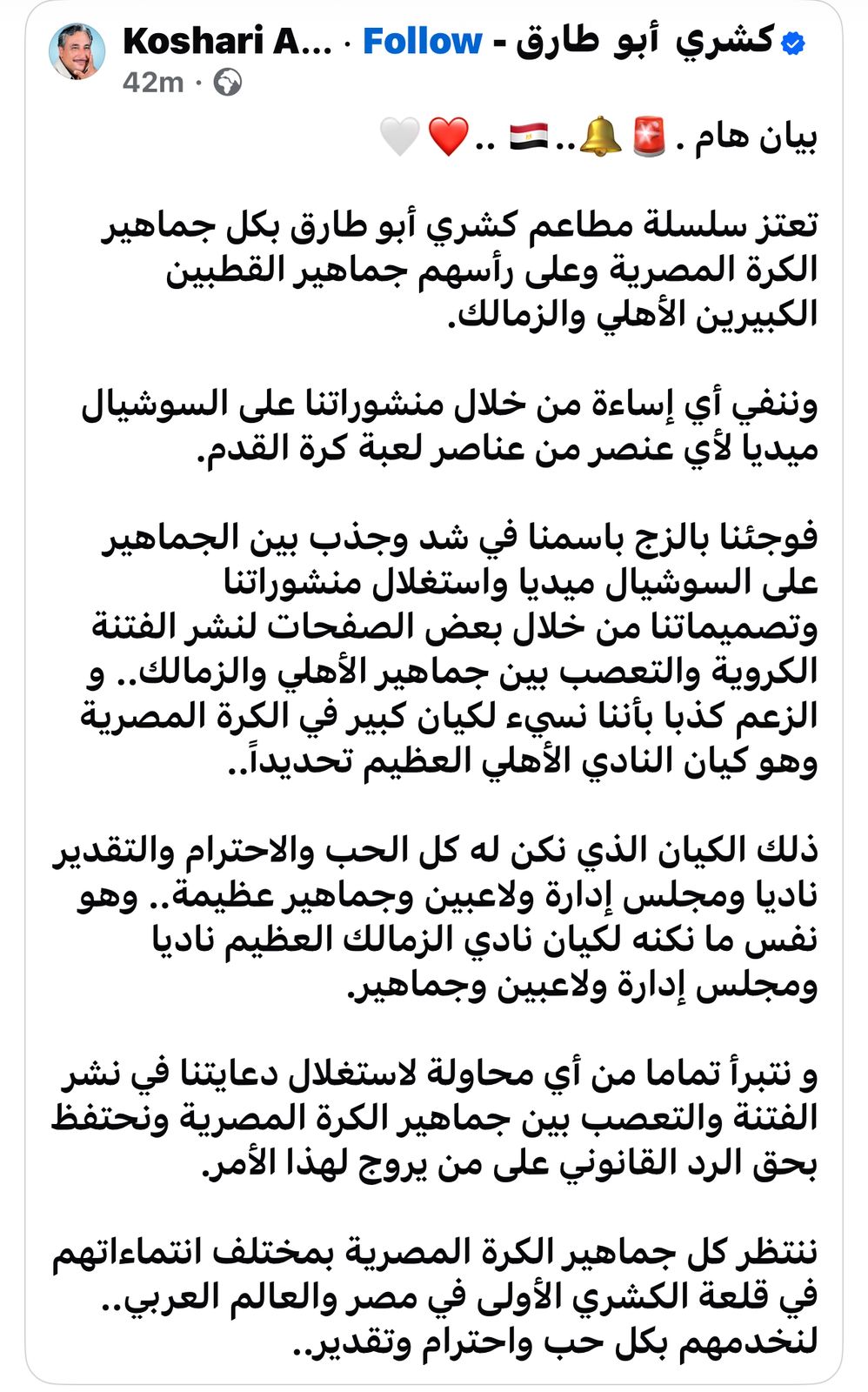 أصدر أحد أشهر محال الكشري (أبوطارق) بيانًا رسميًا، أكد فيه اعتزازه بجماهير الكرة المصرية عامة، وجماهير الأهلي والزمالك على وجه الخصوص، نافيًا تمامًا ما تم تداوله عبر بعض الصفحات على السوشيال ميديا من إساءات منسوبة إليه بحق النادي الأهلي.