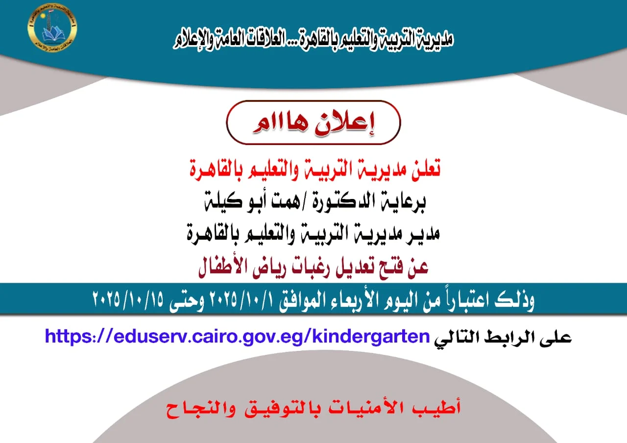 رابط تعديل رغبات رياض الأطفال 2025.. أتاحت مديرية التربية والتعليم بالقاهرة رابطا لتعديل رغبات رياض الأطفال، وذلك اعتباراً من أمس الأربعاء، حتى الأربعاء الموافق 2025/10/15، على الرابط التالي هنا..