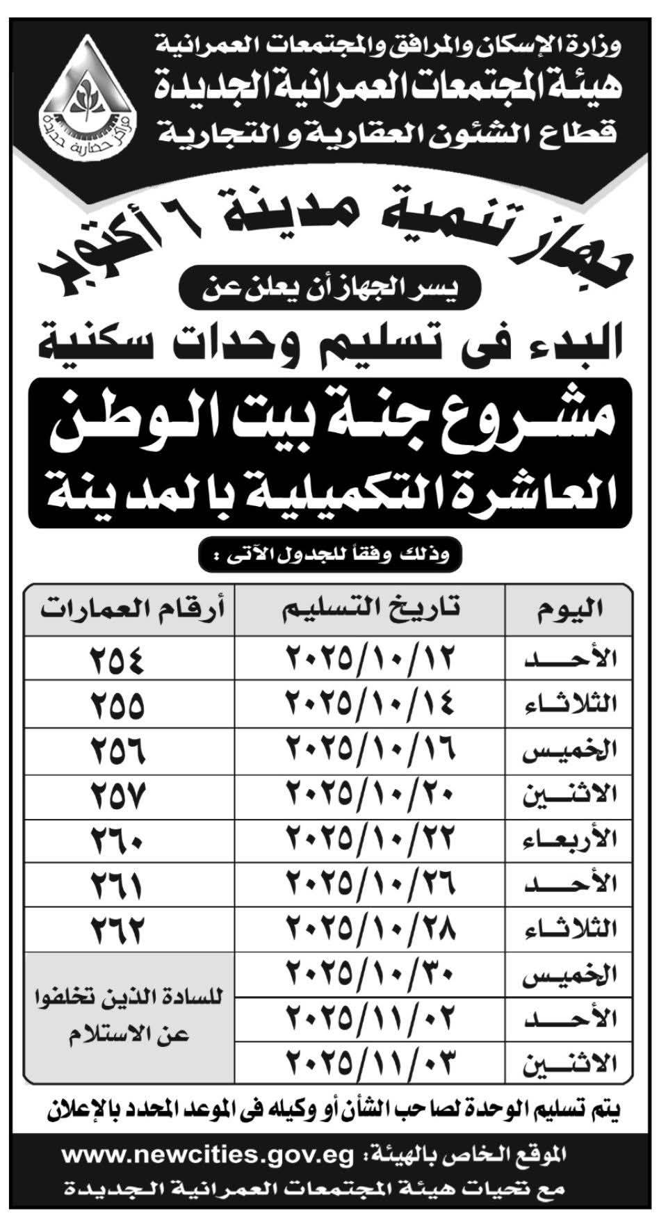 أعلن جهاز تنمية مدينة 6 أكتوبر عن بدء تسليم وحدات سكنية بمشروع جنة بيت الوطن – المرحلة التكميلية، وذلك اعتبارًا من يوم الأحد 12 أكتوبر 2025، وفق جدول زمني محدد لأرقام العمارات.