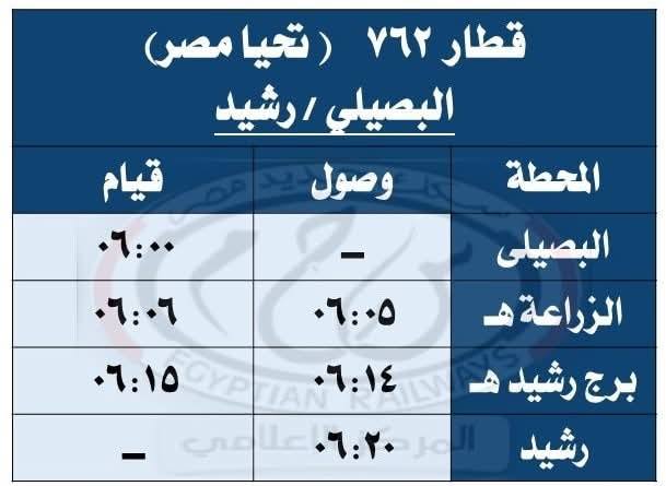 تعديل ميعاد قيام قطار 762 (تحيا مصر) البصيلي/ رشيد ليقوم الساعة 06:00 صباحًا بدلًا من الساعة 06:35 صباحًا.