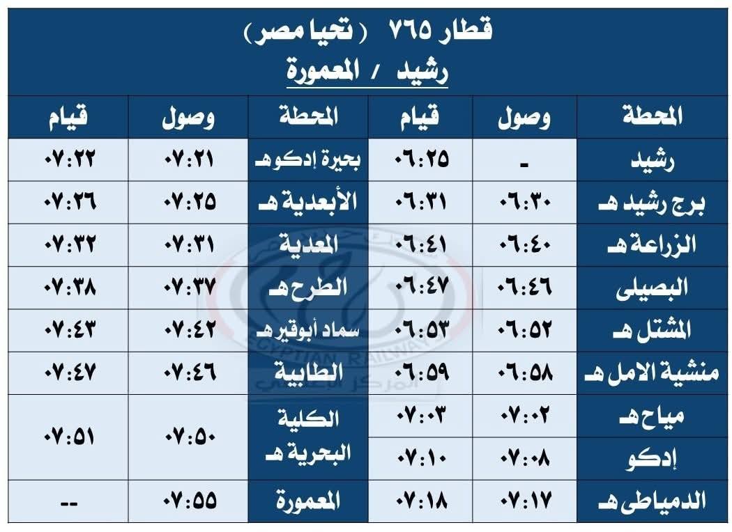 تعديل ميعاد قيام قطار 765 (تحيا مصر) رشيد/ المعمورة ليقوم الساعة 06:25 صباحًا بدلًا من الساعة 07:10 صباحًا.