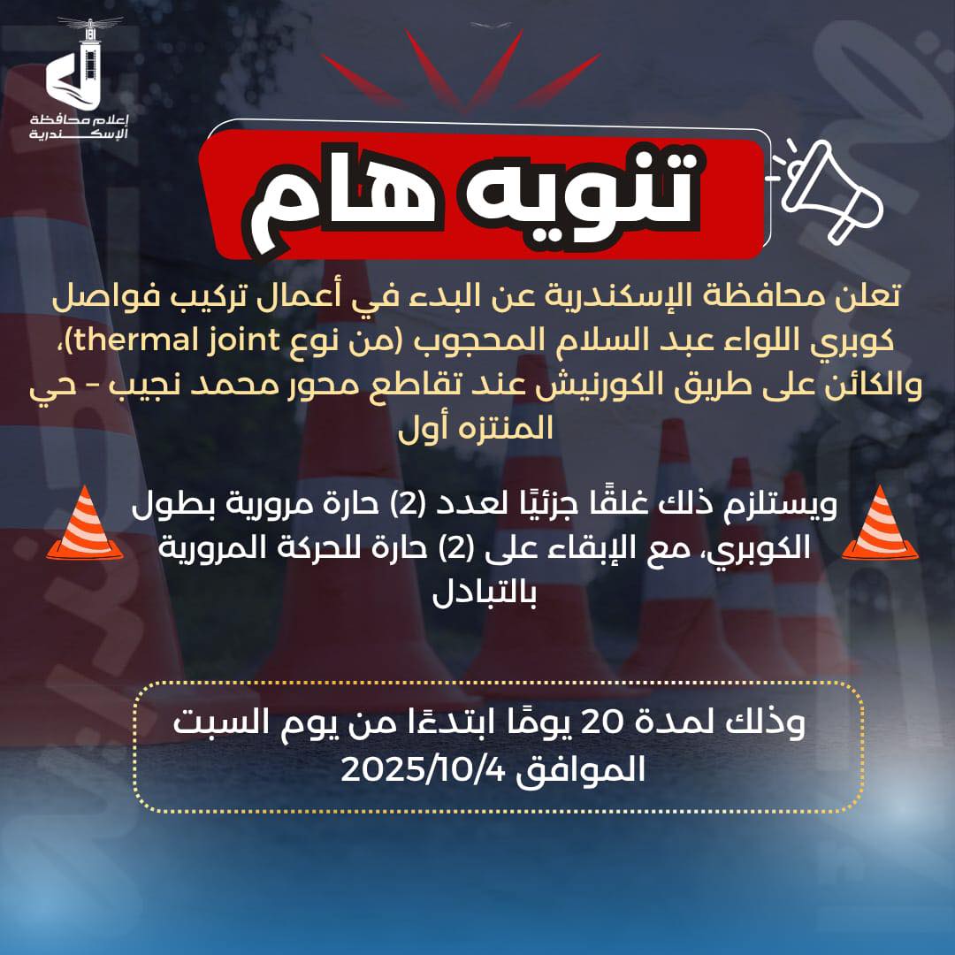 أعلنت محافظة الإسكندرية، عن البدء في تركيب فواصل كوبري عبدالسلام المحجوب على طريق الكورنيش عند تقاطع محور محمد نجيب، بحي المنتزه أول.