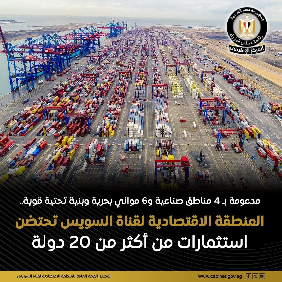 وقالت رئاسة مجلس الوزراء، عبر منشور على موقع «فسبوك»: «بفضل ما تتمتع به المنطقة الاقتصادية لقناة السويس من إمكانيات، تمثل أبرزها في: ضم 4 مناطق صناعية و6 موانئ بحرية على البحر الأحمر والبحر المتوسط، إلى جانب ما تمتلكه من بنية تحتية عالمية المستوى ورؤية واضحة للتكامل بين الموانئ والمناطق الصناعية واللوجستية، نجحت المنطقة في احتضان استثمارات من أكثر من 20 دولة، وهو ما يعكس ثقة المجتمع الدولي في قدراتها كبوابة للتجارة العالمية ومركز متكامل للصناعة والخدمات».
