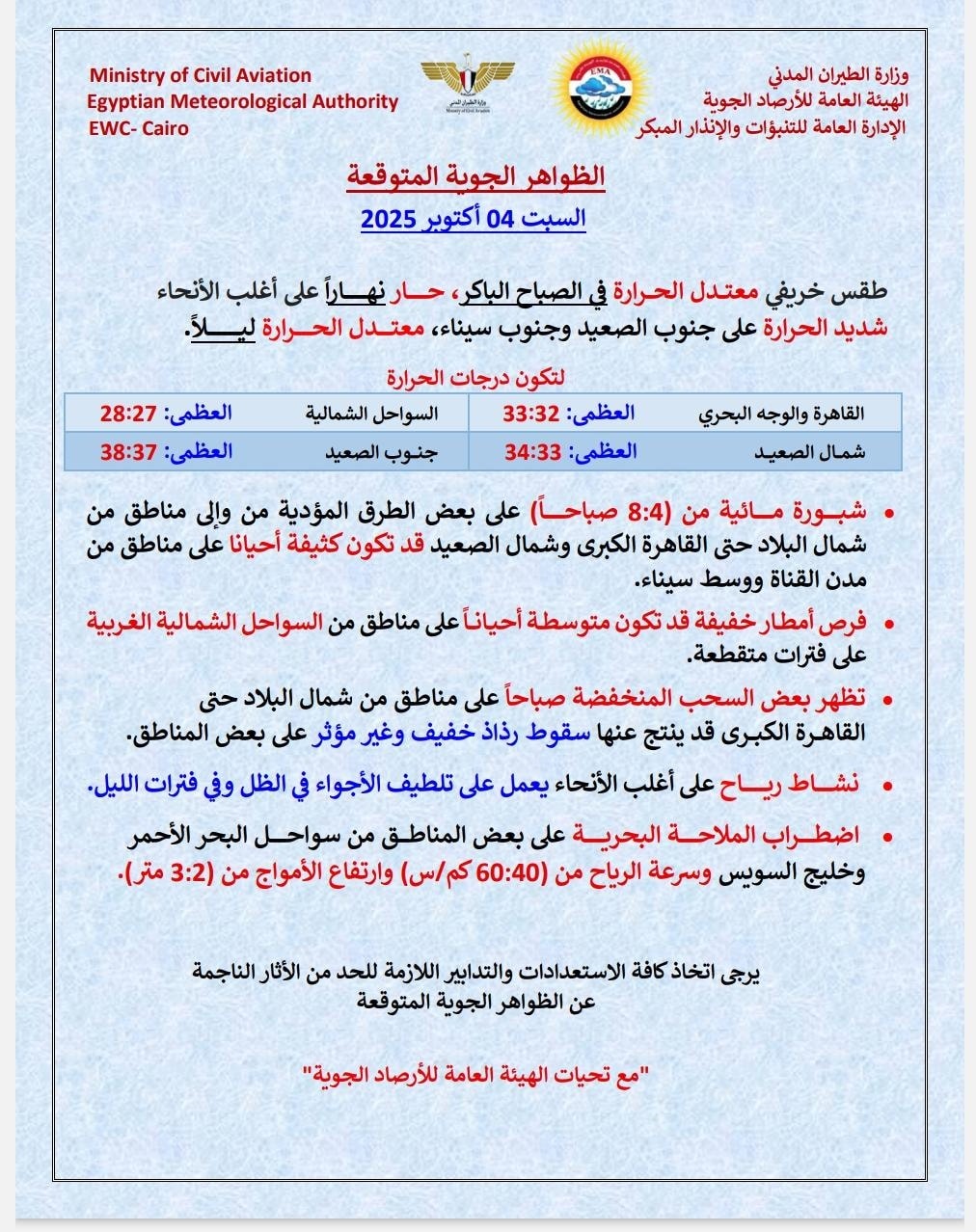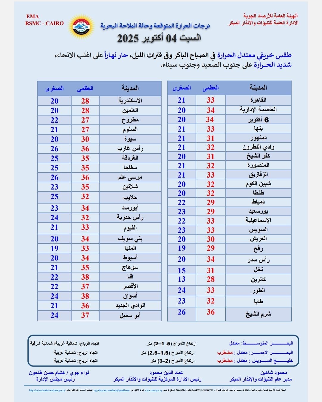 كشفت هيئة الأرصاد الجوية، عن توقعاتها حول حالة الطقس، السبت 4 أكتوبر 2025، في ظل استمرار الطقس الحار خلال ساعات النهار، بينما يسود طقس خريفي معتدل خلال ساعات الليل.