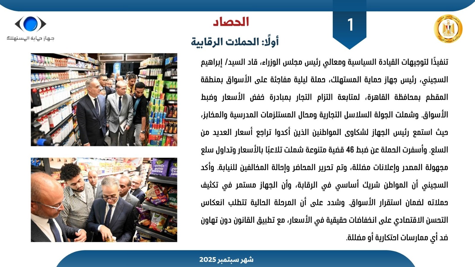 استعرض جهاز حماية المستهلك في تقرير تلقاه إبراهيم السجيني رئيس جهاز حماية المستهلك، عن جهوده الرقابية في ضبط الأسواق وأسعار السلع، فضلًا عن تلقي شكاوي المستهلكين في مختلف القطاعات والتعامل معها وأبرز الأنشطة، خلال شهر سبتمبر.