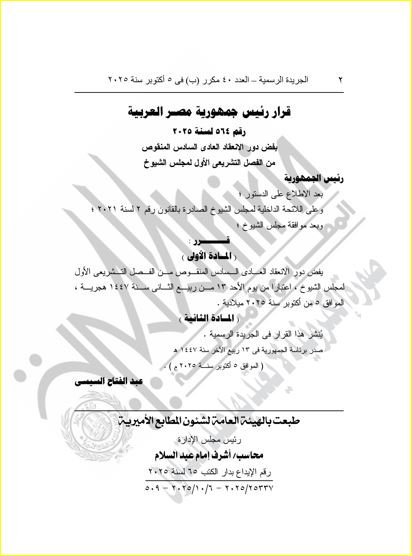 نشرت الجريدة الرسمية قرار السيد الرئيس عبد الفتاح السيسى رقم 564 لسنة 2025 بفض دور الانعقاد العادى السادس المنقوص من الفصل التشريعى الأول لمجلس الشيوخ.