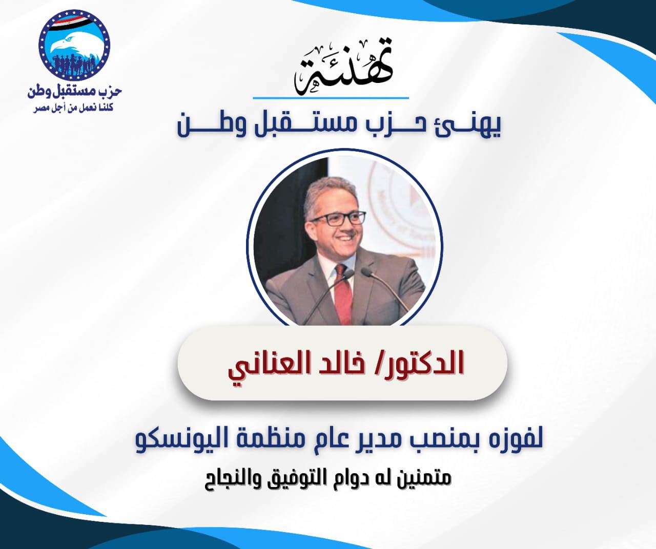 هنأ حزب مستقبل وطن الدكتور خالد العناني، بفوزه بمنصب مدير عام منظمة اليونسكو، متمنين له دوام التوفيق والنجاح.