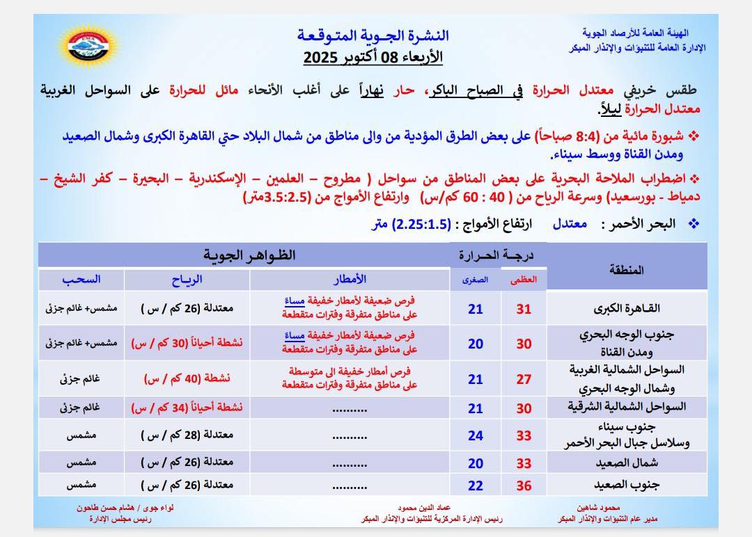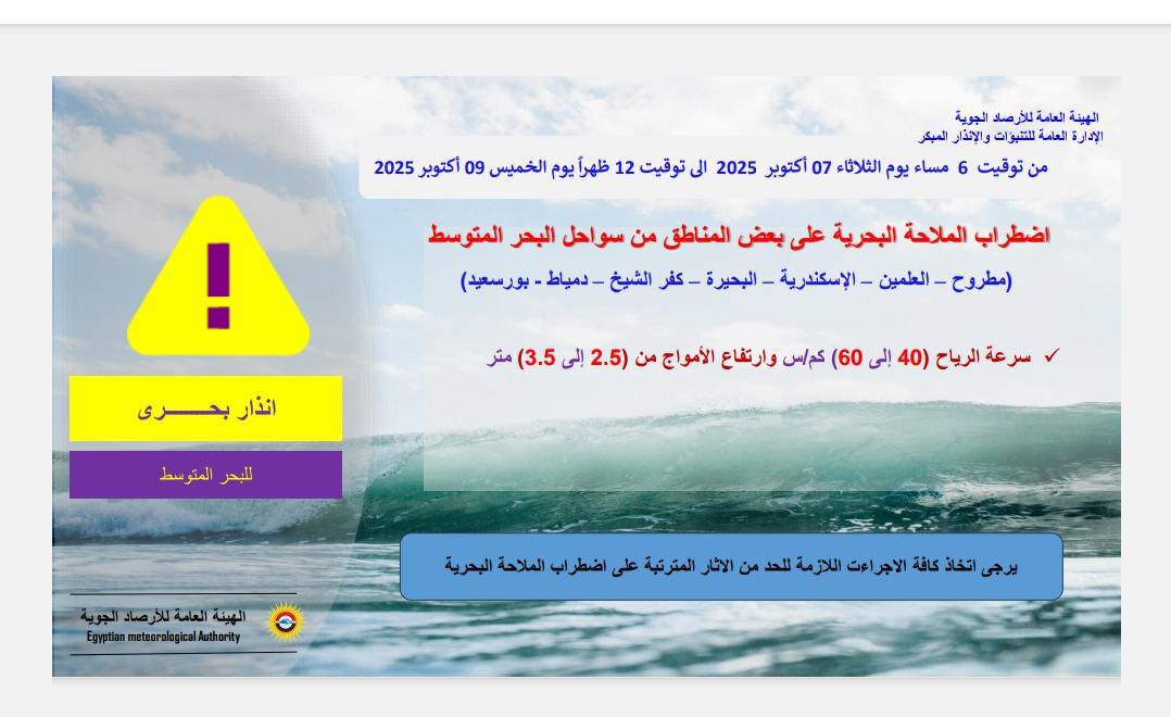 حذرت الإدارة العامة للتنبؤات والإنذار المبكر بالهيئة العامة للأرصاد الجوية، من اضطراب الملاحة البحرية على بعض المناطق من سواحل البحر المتوسط (مطروح - العلمين - الإسكندرية - البحيرة - كفر الشيخ – دمياط - بورسعيد)، وذلك من توقيت 6 مساء يوم الثلاثاء 07 أكتوبر 2025 الى توقيت 12 ظهراً يوم الخميس 09 أكتوبر 2025، حيث تبلغ سرعة الرياح (40) إلى 60 كم/س وارتفاع الأمواج من 2.5 إلى 3.5 متر.