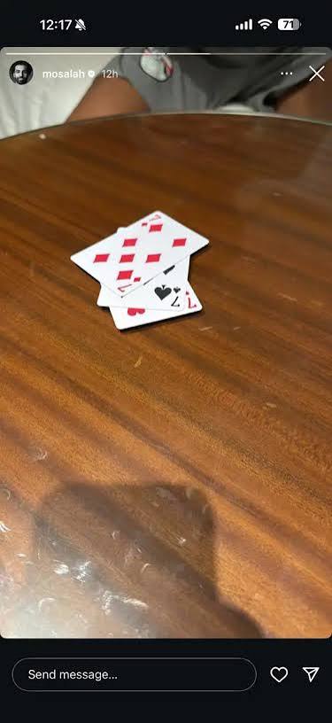 نشر النجم محمد صلاح، قائد منتخب مصر ولاعب ليفربول الإنجليزي، صورة عبر حسابه الشخصي بموقع إنستجرام، لثلاث ورقات من لعبة "الكوتشينة" تحمل الرقم 7.